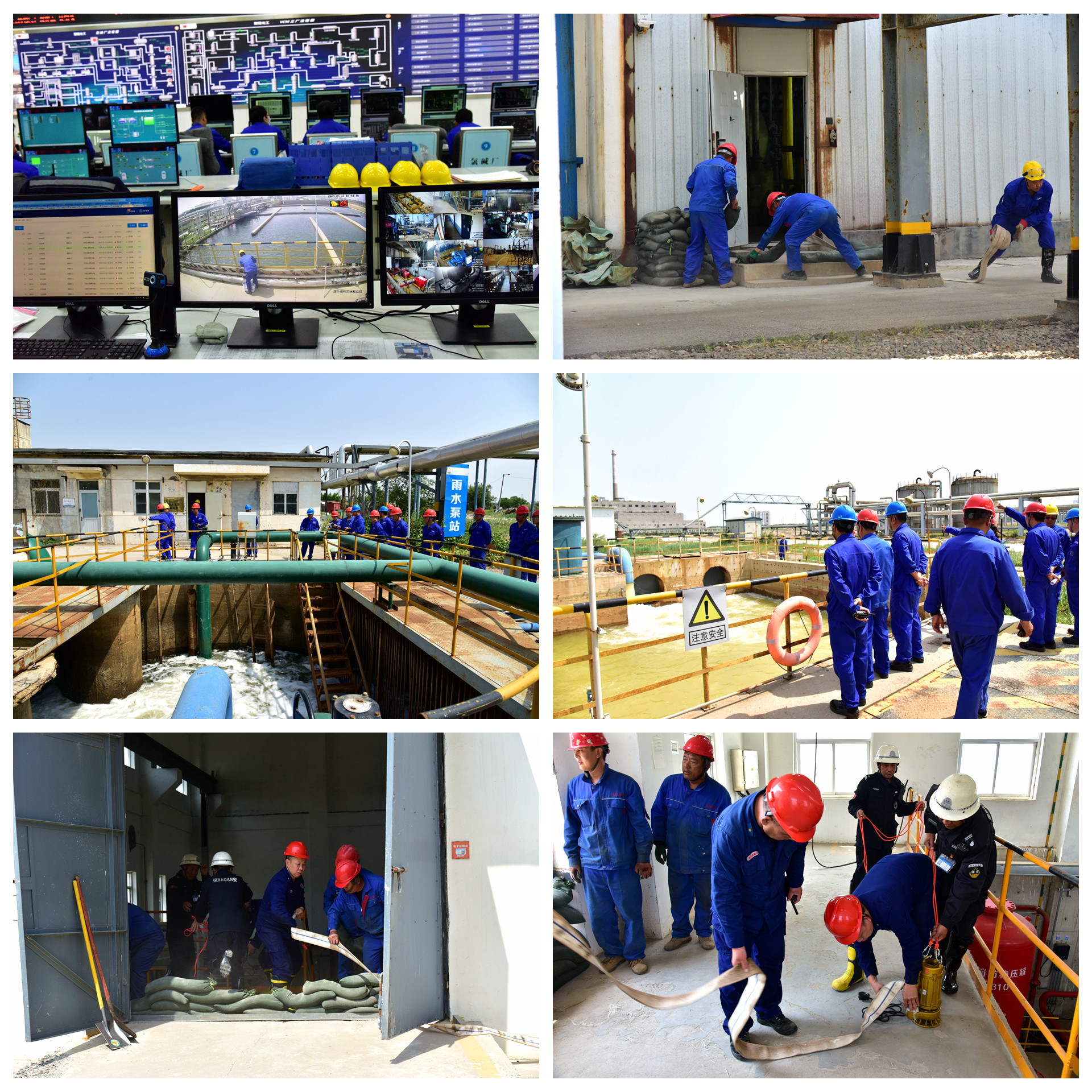 雨季三防指揮部領(lǐng)導(dǎo)前出一線指揮,派出質(zhì)量管理部化驗人員前往雨水池取樣,在緊急化驗確認(rèn)雨水匯集池PH值、COD等指標(biāo)符合排放標(biāo)準(zhǔn)后,命令公用工程廠開啟23萬噸雨水泵及40萬噸雨水泵迅速外排積水;與此同時,氯堿廠、公用工程廠等擁有半地下、地下作業(yè)場所的部門,迅速組織突擊隊員在入口處利用防汛沙袋筑建擋水圍堰,防止積水倒灌;演練還模擬個別地下作業(yè)場所出現(xiàn)進水緊急狀況,后勤保衛(wèi)部經(jīng)警迅速設(shè)立警戒區(qū),防止人員誤入觸電,消防隊迅速到場開展救援作業(yè),鋪設(shè)消防水籠,接駁潛水泵,電氣部人員為潛水泵做好絕緣措施,接通臨時用電,開展抽水排水作業(yè),確保設(shè)備設(shè)施安全。至此,演練順利結(jié)束。